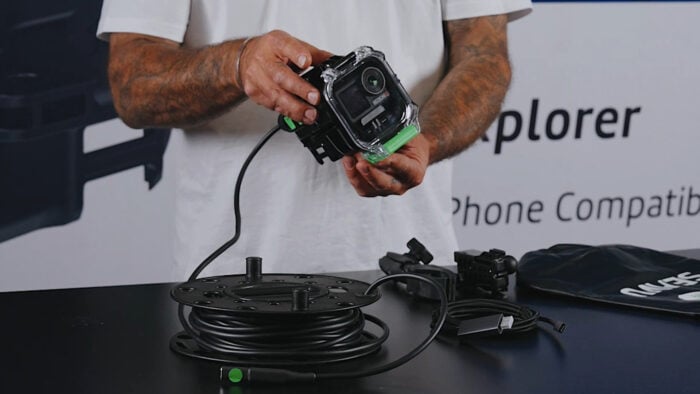 6. Plug the Explorer+ Media Cable into the adapter, then gently click the camera into the Explorer+ housing.